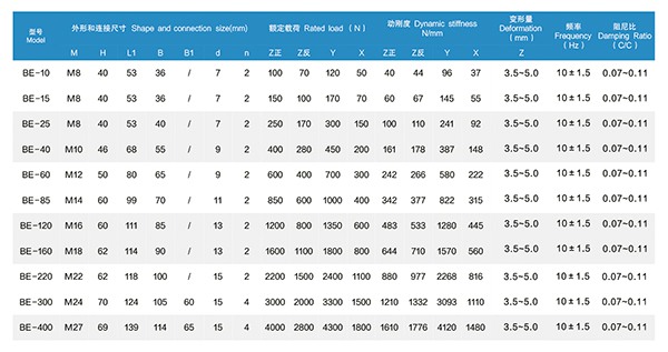 BE型橡膠減振器由金屬與橡膠復合制成,金屬表面全部包復橡膠,能防止金屬銹蝕。產品具有耐油、耐海水、耐鹽霧和日照等,能滿